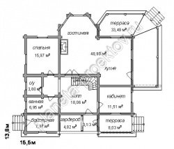 Просторный дом из калиброванного бревна способен удовлетворить даже самые изысканные требования к архитектуре. Сочетание двускатной и четырехскатной кровли и вынесенных из общего плана террас делают коттедж по-настоящему уникальным. Широкая терраса летом может использоваться как летняя столовая.