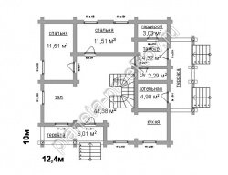 Просторность, оригинальность и сложность внутренней планировки делают готовый дом из оцилиндрованного бревна комфортным для проживания. В коттедж ведут две террасы: через одну можно попасть в бытовую зону (тамбур, разделенный на санузел, котельную и гардероб), а через вторую – в гостевой сектор, состоящий из зала с кухней (они соединены сквозным проемом) и двух спален.