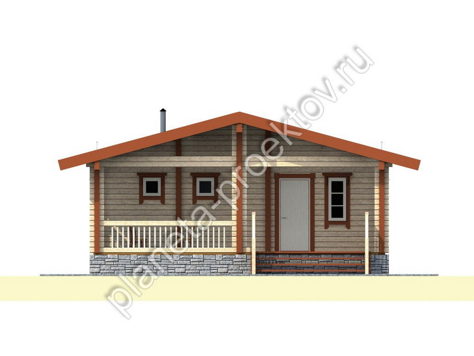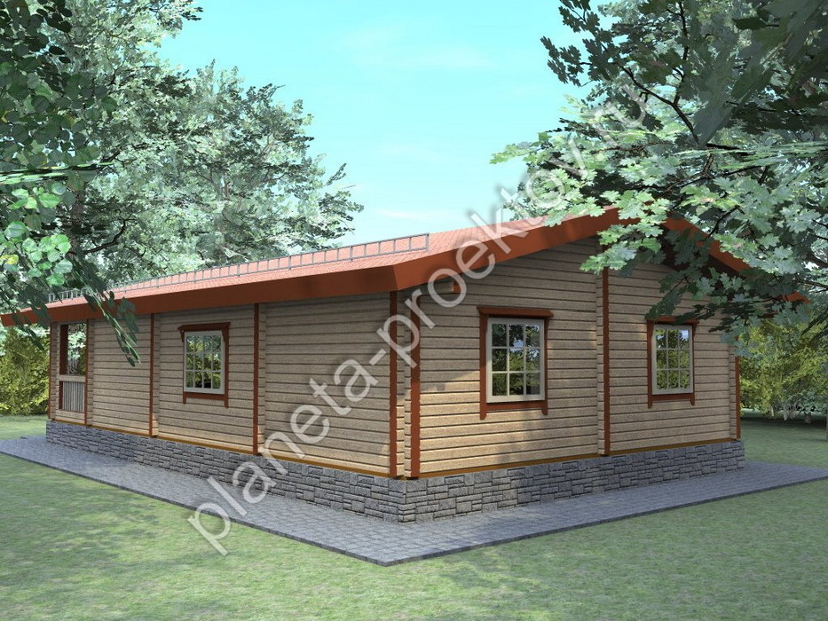 Выгодным и практичным вариантом загородного домостроения станет возведение жилого дома-бани. Такого рода постройки подходят как для сезонного, так и для постоянного проживания. Преимуществ их очевидны: вы экономите свои финансовые средства и земельные ресурсы, построив один объект вместо двух. Данный проект дома из бруса с баней привлекает своей компактностью и функциональностью. Перед входом в помещение находится протяженная терраса, где летом можно оборудовать зону отдыха. Рядом с выходом весьма логично и предусмотрительно расположены хозяйственные помещения: холл, санузел (с душевой) и туалет. Здесь же рядом находится парная. Центральную часть постройки занимает просторная и протяженная гостиная-кухня, которую при желании можно разделить на два самостоятельных помещения. Также согласно планировке в доме предусмотрены две одинаковые по размерам спальни.