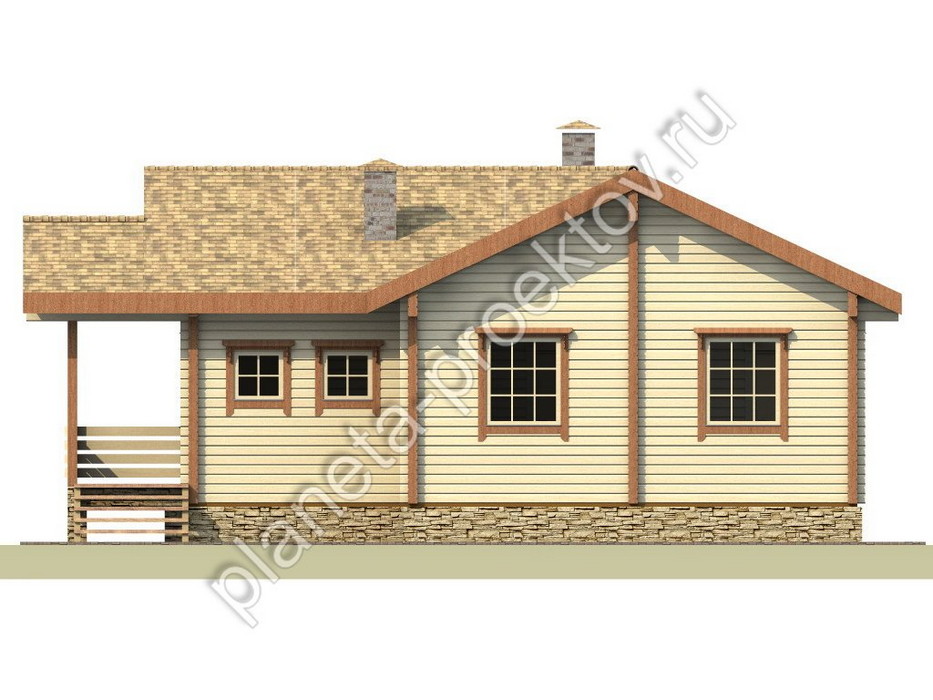 Грамотно спланированный миниатюрный одноэтажный дом станет прекрасным вариантом как для сезонного, так и для постоянного проживания небольшой семьи. Во внутренней планировке всё предусмотрено для создания комфортабельных условий. Жилое пространство этажа организует небольшой холл, из которого открывается доступ ко всем помещениям. Здесь запланированы две спальни, просторная гостиная, кухня и санузел. Поскольку постройка отличается компактностью и небольшими размерами, можно рассматривать данную разработку и в качестве проекта гостевого дома из бруса. Здесь вы всегда сможете разместить своих друзей или приехавших в гости родственников. Как правило, такие строения размещаются на загородном участке в дополнение к основному большому коттеджу и выполняются в едином стиле для создания гармоничного архитектурного ансамбля.