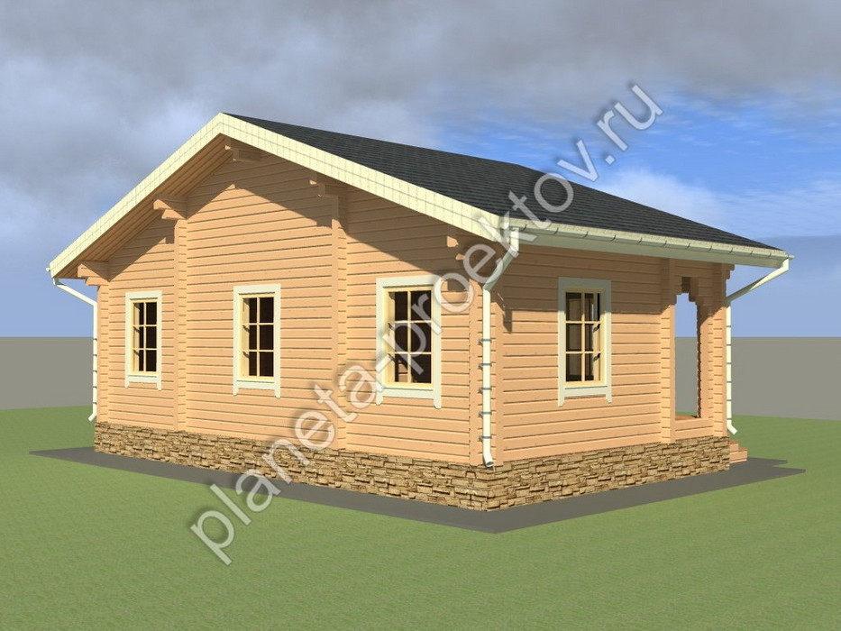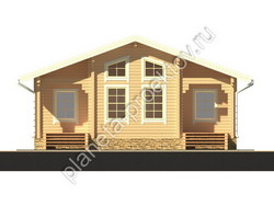 Маленький уютный домик подойдет как для постоянного проживания семейной пары, так и для сезонного проживания на даче или в деревне. Внешний облик постройки довольно прост и при этом привлекателен. При проектировании постройки в основу был положен принцип симметричности. Если взглянуть на фасад строения, то сразу можно оценить пропорциональное и симметричное расположение окон и двух небольших террас, которые предваряют вход в помещение. Внутренняя планировка также выполнена с соблюдением принципа симметричного расположения комнат. Данный проект маленького дома из бруса отличается особой компактностью и лаконизмом. В центральной части постройки располагается гостиная, за которой находится санузел. Угловыми помещениями являются кухня и спальня, из которых есть выход на террасы.