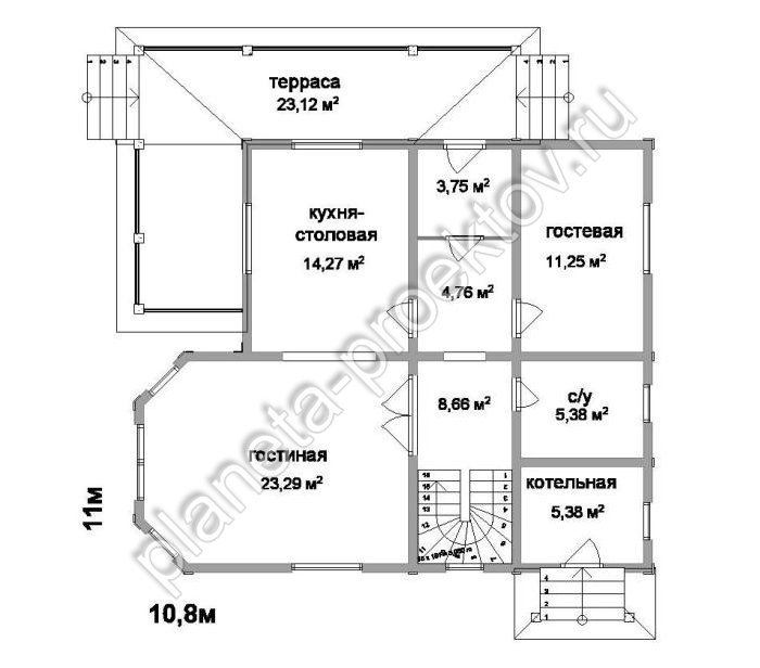 Привлекательность данного проекта во многом обусловлена особенностями архитектуры. Просторная угловая терраса удачно дополняет постройку и украшает её. Белые перила с балясинами и симметрично расположенные столбы контрастируют с основным цветом постройки и выделяются на его фоне. С террасы предусмотрен вход в коттедж: через тамбур вы попадаете в холл, который открывает доступ к остальным помещениям. На первом этаже есть кухня-столовая, которую при желании вы можете разделить на две самостоятельные комнаты, используя разные способы зонирования. Гостиная располагается в зоне эркера, в результате чего это помещение выглядит очень просторным и отличается хорошим естественным освещением из-за наличия четырех окон. Помимо этого на первом этаже есть гостевая и санузел. Котельная, согласно технике пожарной безопасности, размещена в отдалении от жилых комнат и имеет отдельный вход с улицы. Территория второго этажа отведена под зону отдыха. В зоне эркера расположена большая спальня, которую целесообразно использовать в качестве комнаты для родителей. Две другие спальни, более маленькой площади, подойдут для детских комнат. Также эти проекты домов предусматривают наличие ванной и небольшой кладовки.