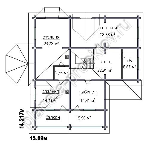 Просторный двухэтажный особняк предназначен для проживания большой семьи из 6-7 человек. Несмотря на то, что общая площадь постройки достаточно велика – 281 м2 – внешне строение выглядит довольно аккуратным и изящным. Во многом это обусловлено тем, что коттедж дополнен такими элементами, как эркер, терраса, балкон, слуховое окно. Они украшают и визуально облегчают постройку. Преимущество проекта дома из бруса с эркером заключается не только в том, что внешне постройка выглядит красиво, но так же и в том, что внутреннее пространство комнаты с эркером значительно расширяется и существенно улучшается естественное освещение (благодаря большому количеству окон). В коттедж предусмотрено три входа. Парадный вход проходит через крыльцо в холл, дополнительный – через террасу в гостиную. Также предусмотрен ещё черный вход через топочную. Планировка первого этажа продуманна и удобна. Условно можно разделить всю территорию на две части. К первой можно отнести все хозяйственные помещения: холл, душевую, два санузла, топочную, кладовку. Во второй части дома располагаются жилые комнаты: две спальни и гостиная, в которой можно выделить кухонную зону. На втором этаже по проекту предусмотрены три спальни, кабинет, балкон и дополнительный санузел.