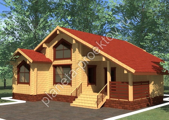 Компактный, но при этом вместительный и комфортабельный коттедж подойдет для постоянного проживания небольшой семьи из 3-4 человек. Внешний облик строения отличается простотой и привлекательностью. Весьма удачным оказывается запланированное цветовое решение: крыша, оконные рамы, перила крыльца и террасы вступают в яркий цветовой контраст со стенами. Внутренняя планировка предусматривает наличие всех необходимых для комфортабельного проживания помещений. Рядом со входом расположен тамбур и гардероб. Кухня и столовая объединены в одно помещение, что позволяет использовать пространство более рационально. Гостиная располагается в центре, а из неё открывается доступ к другим помещениям: трем спальням. Если вам понравилась данная разработка, но вас интересуют проекты одноэтажных домов из бруса с гаражом, наши специалисты могут усовершенствовать готовое решение, дополнив его гаражной пристройкой.