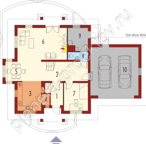 Композиционный план во многом схож с жилыми объектами, которые можно возвести по проектам деревянных домов. То же самое можно сказать и про планировочное решение, которое предполагает обустройство двух жилых ярусов. Первый этаж, как и в большинстве остальных проектов, отдан под гостевую зону, дополненную бытовой. А второй, то есть мансардный – это зона отдыха. Примечательно, что на втором этаже планируется обустройство отдельной комнаты, которая будет дополнена своим санузлом. Ее можно использовать как помещения для гостей.