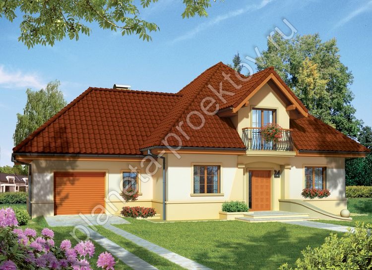 Индивидуальность и яркость – вот главные отличительные черты такого направления в строительстве, как кантри. Оригинальность экстерьера объясняется тем, как подобраны строительные материалы, а также грамотным подходом к организации пространства. Кроме того, интересен и архитектурный план: шатровидная кровля оригинально сочетается с эркером, люкарнами, балконом и красивой галереей-террасой. Органично пристроен к жилому зданию и гараж, благодаря чему коттедж становится цельным и завершенным.