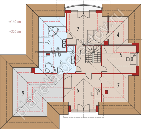 Площадь застройки: 226.61 м2 Строительный объем: 901.65 м3 Ширина: 19 м Глубина: 16 м Высота: 9.00 м Мин. размеры участка: 26.5x27.0 м Площадь кровли: 375.0 м2 Уклон кровли: 35 ° Гараж: 1 Мансарда: да Цокольный этаж: нет