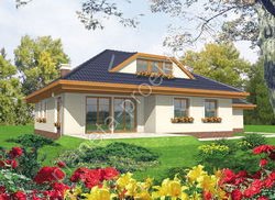 Коттедж с простой конструкцией, возведенной под четырехскатную кровлю, имеет лаконичный экстерьер. Сказывается это в симметричном оформлении центрального фасада, где ровно посередине располагается входная группа. Кроме того, к основному зданию пристраивается гараж, позволяя более рационально использовать земельный участок. С тыльной стороны коттеджа будет располагаться галерея-терраса, украшениями которой выступают высокие панорамные окна. Оригинальным архитектурным решением является обустройство в скатах кровли люкарн нетрадиционной формы.
