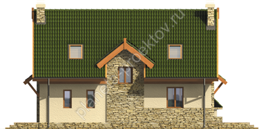 С тыльной стороны коттеджа располагается галерея-терраса, где установлен камин: в летнее время здесь можно организовывать пикники. Организация пространства внутренних помещений характеризуется свободой планировки, поскольку здесь будет образовано единое пространство из гостиной, столовой и кухни. Мансарда также обустроена лаконично и грамотно: здесь оформлено несколько спален, каждая из которых отличается четкими границами. По своим конструктивным особенностям данный коттедж напоминает аналоги, которые предлагают возвести проекты деревянных домов.