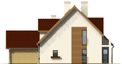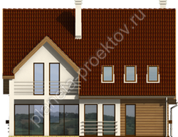 С тыльной стороны дома располагается галерея-терраса, оформленная в классическом стиле рядом колонн. Большие площади остекления позволяют сделать внутренние помещения более освещенными, причем освещение естественное. С точки зрения планировки все довольно просто и традиционно. На первом этаже оформляется зона для приема гостей, причем просторов этажа достаточно, чтобы разграничить кухню и гостиную. Мансарда будет занята зоной отдыха. Оригинальным решением в данном коттедже является камин, расположенный обоих ярусах. Для желающих построить жилье из более экологичных материалов подойдут проекты деревянных домов.
