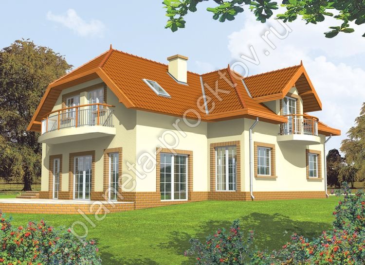Дом в стиле кантри, выполненный из бетона и отличающийся вместительностью, имеет четкую и простую геометрию архитектурного решения. Законченная по смыслу художественная композиция достигается за счет сочетания симметричности расположения блоков, четырехскатной кровли, к которой примыкают люкарны и двускатные элементы. Парадный вход оформлен в нише, при этом над ним располагается оригинальная люкарна, облицованная декоративным кирпичом.