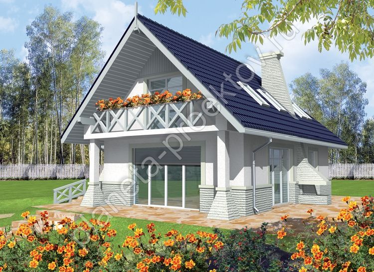 Оригинальный подход к отделке выражается в интересном решении, принятом для оформления фундамента и декоративных колонн. Над террасой располагается просторный балкон, при этом украшением данной зоны является камин. Организация пространства первого этажа строится вокруг гостиной, которая комбинируется с кухней и обеденной зоной. В жилой мансарде планируется расположить зону отдыха. Конструктивные особенности напоминают коттеджи, выполненные по проектам домов из дерева.