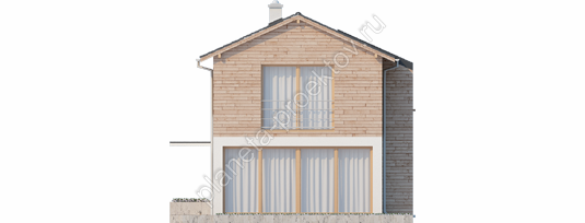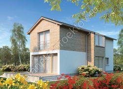 Если у вас узкий участок, то данный проект предлагает оптимальное решение – дом из бетона в современном стиле. Сначала кажется, что в его конструкции нет ничего необычного, но это только на первый взгляд. При достаточно традиционной скатной кровле он имеет целый ряд отличительных особенностей. Во-первых, кровля узкая и слегка нависает над основным зданием. Во-вторых, выразительна отделка – отдельные участки стен отделаны как штукатуркой, так и декоративным кирпичом. Единственными выступающими элементами являются эркер и небольшая галерея, которая располагается с тыльной стороны здания.