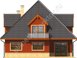Данный проект предлагает возвести самую настоящую усадьбу, поскольку строительный объем достигает больше 450 кв.м. Основное здание дома из бетона в американском стиле возводится под шатровую крышу, которая богато декорирована люкарнами и балконами. Кроме декоративной функции они несут в себе и определенные функциональные возможности, то есть дают возможность более интересного интерьера. Крыша кажется намного габаритнее, нежели основное здание, вследствие чего возникает ощущение надежности и добротности всего дома.
