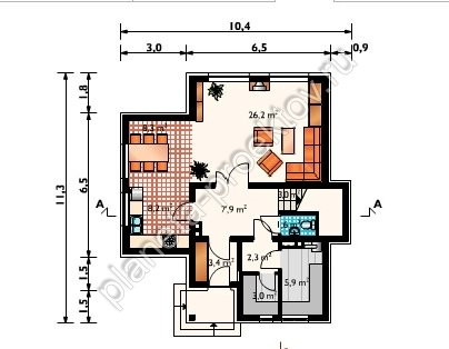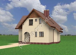 Г-образной формы гостиная служит главным помещением первого этажа. Кроме гостевой зоны здесь будут располагаться санузел и два технических помещения. Второй этаж полностью занят зоной отдыха, которая дополняется оборудованием санузла. При всей компактности здания многочисленные выступы в конструкции делают затруднительным расположение коттеджа на участке. Поэтому для стандартной по размерам приусадебной территории лучше всего выбирать проекты домов из бруса.