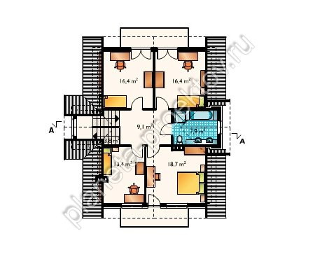 Прямоугольная конструкция, лежащая в основе жома из бетона, построенного в американском стиле, подойдет для горизонтально расположенного участка. Лаконичность оформления экстерьера отражается в том, что единственными архитектурными украшениями фасада являются люкарна и балконы. На тыльную сторону фасада, на небольшую террасу, выходит гостевая зона. Традиционность складывается из минимального количества декоративных элементов, двускатной кровли и функциональности каждого жилого помещения.