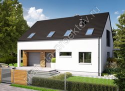 Готовые проекты домов в современном стиле поражают взгляд большим количеством остекленных площадей. В таком коттедже можно не бояться возможной темноты в помещениях! В достижении выразительности внешнего облика играют раздвижные стеклянные двери, ведущие в гостиную. При этом еще одна пара таких же дверей ведет из гостиной на другую сторону участка. Просторная галерея перед домом дает возможность использовать ее как зону отдыха. Оригинально смотрятся и имитированные под балконы окна размером с дверь, расположенные на мансарде. Кроме того, естественное освещение достигается с помощью мансардных окон.
