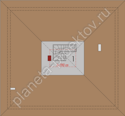 Объемно-планировочное решение традиционно и логично. Центром коттеджа является просторная гостиная, совмещающая в себе столовую и кухню. В гостиной располагается эркер, в котором удобно разместить столовую. Внутренние помещения предназначены под три спальни. Завершают планировку оборудованные в зоне отдыха санузел и ванная комната. Бытовое помещение имеет выход во двор. Четырехскатная кровля гармонично сочетается с галереей-террасой.
