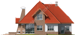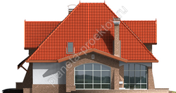 Оригинальная конструкция коттеджа, в основе возведения которого лежит проект дома из блоков в стиле кантри, приковывает к себе взгляды. Его экстерьер – это широкое разнообразие архитектурных приемов, которые использованы на одном пространстве. Каждый элемент архитектуры возведен под свою кровлю разной конструкции, благодаря чему цельный облик строения отличается разноплановостью. Выразительно смотрится оформление галереи-террасы, выйти на которую можно через гостиную. Ее оформляют полукруглые панорамные окна, а завершают формирование облика колонны трапециевидной формы. Камин дополняет оформление террасы.