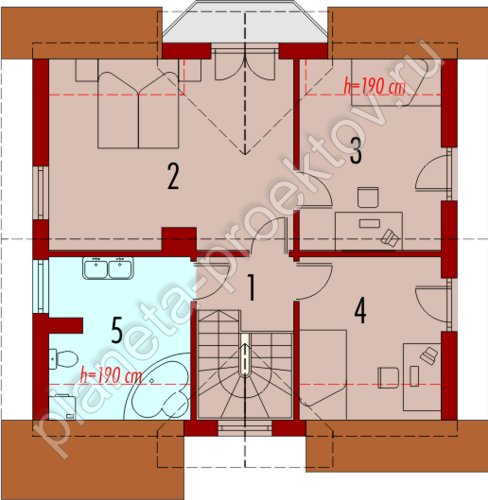 Коттедж имеет квадратный план, что говорит о возможности его размещения даже на небольшом участке. В прямоугольной гостиной с эркером располагаются непосредственно зона для приема гостей и бытовая зона, представляющая собой одно помещение из кухни и столовой. Кабинет, санузел и кладовая комната завершают план строения. Мансарда будет оформлена под помещения личного характера, где будут расположены три комнаты. Одна спальня будет выходить на балкон фасада, а две другие оснащаются окном-балконом. Ванная завершает планировку строения.