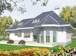 Жилая площадь данного коттеджа имеет большие размеры, поэтому есть возможность грамотно разграничить гостевую зону от зоны отдыха. В эркере полукруглой формы удачно располагается столовая. Гостевая зона выходит на террасу, где можно удачно оборудовать место для летнего отдыха. Кабинет, кладовая и санузел завершают планировку этажа. Гараж пристраивается к дому, но не связан с жилым помещением отдельным входом. Планировка мансарды отличается оригинальностью, поскольку и помещение над гаражом использовано как спальня. Ванная завершает планировку всего яруса.