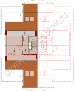 На первом этаже запланировано обустройство зоны для всей семьи. Основное помещение – это гостиная, связанная с кухней нешироким входом. Далее по коридору располагаются кабинет и санузел. Второй этаж отдан под зону для личного пользования, в которой будут оформлены три спальни. Ванная венчает планировку всего строения.