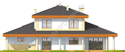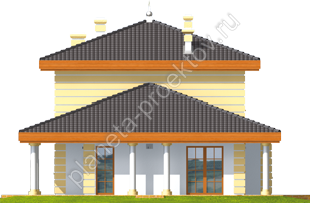 Двухъярусный дом из блоков, построенный в американском стиле, имеет привлекательный экстерьер. Каждый этаж возведен под самостоятельную четырехскатную кровлю, при этом второй ярус имеет меньшие размеры, что делает коттедж необычным и колоритным. Дом имеет вытянутую конструкцию, а потому все помещения в нем планируются на основании принципа максимального удобства. Практически по всему периметру строения располагается терраса, украшениями которой служат колонны. Окна разной конфигурации и размера придают дому нарядный внешний вид.