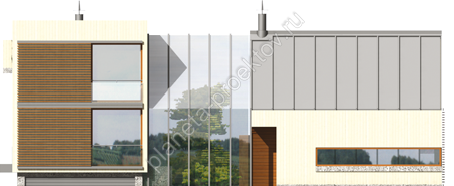 Планировочное решение, примененное в этом строении, отличается логичностью и практичностью. В оформлении первого этажа доминируют стеклянные поверхности: практически по всему периметру гостевой зоны ее стены полностью остеклены. Гостиная имеет просторную площадь, а кухня и столовая располагаются отдельно от нее. На этом же ярусе обособлена комната, в которой оборудуется ванная: она может использоваться в качестве комнаты для гостей. На втором этаже планируется расположить две комнаты, дополнительно оборудованные санузлами.