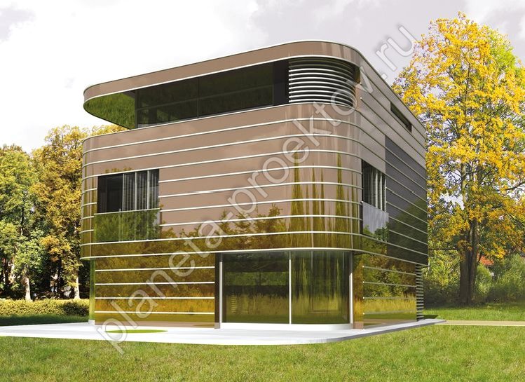 Просторность и оригинальность формы является сочетанием, который отличает данный дом из блоков в стиле хай-тек. Полукруглая форма конструкции позволяет создать обтекаемость строения, при этом вместо привычных углов строение имеет оконные проемы оригинальной конфигурации. Несмотря на то, что коттедж имеет большие площади остекления, каждый ярус визуально отграничен от другого. При этом каждое помещение связано с остальными за счет того, что дом практически лишен стен и перегородок.