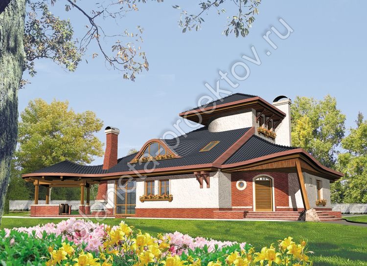 Своеобразный и эффектный дом в стиле кантри, возведенный из блоков, обращает на себя внимание с первого взгляда. В первую очередь выразительно смотрится то, что строение состоит из нескольких объемов, каждый из которых имеет свою кровлю. При этом она оформляется для каждого этажа по-разному, за счет чего дом и выглядит столь необычно и привлекательно. Конструкция кровли из-за своей изогнутости и плавности несколько напоминают строения, возводимые в Японии. Оригинально смотрится вынесенная за пределы жилого здания и одновременно соединенная с ней веранда-беседка, где можно устроить уютное местечко для отдыха летом.