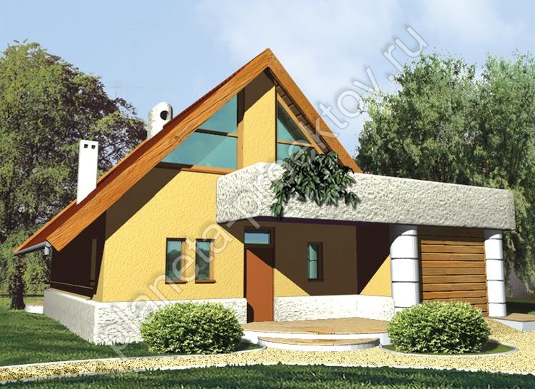Конструкция строения имеет прямоугольный план, при этом ее оригинально дополняют две террасы нестандартной формы. При этом пространство над гаражом может быть обустроено как уютное место отдыха летом. Согласно плану, на первом этаже будет оформлена гостиная, небольшая часть которой занята кухней. Небольшой кабинет и расположенный напротив санузел завершают планировку. Гараж связывается с жилыми помещениями через небольшой холл. В мансарде планируется обустроить комнаты отдыха, которые дополняет ванная.