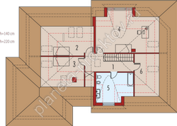 Три террасы, установленные по всему периметру коттеджа, позволяют максимально полно использовать площадь участка. Первый этаж условно состоит из двух половин. Первую планируется занять гостевой зоной квадратной формы, одна стена которой скошена – она образует выход на галерею-террасу. Гостиная отделяется от кухни дверями-купе. Вторая часть помещений состоит из спальни, бытовой комнаты и санузла. В мансарде будет обустроена зона отдыха, которую дополнит ванная комната.