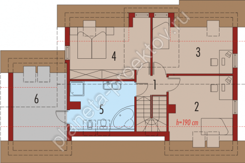 Угловая галерея-терраса отличается достаточной просторностью и связана она с гостиной. Ее нестандартная конструкция способствует тому, что непосредственно зона для принятия гостей отделена от кухни. Объемов этажа достаточно для того, чтобы разместить здесь кабинет, кладовую и санузел. В мансарде планируется сформировать зону личного пользования, в состав которой войдут три комнаты, а завершит планировку ванная. Пространство над гаражом можно использовать как чердак.