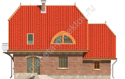 Данный дом из блоков, возведенный в американском стиле, имеет черты, делающие его приближенным к замковому направлению строительства. Оригинальный эркер во всю стену двухэтажного особняка, над которым установлена шатровая крыша, выглядит очень выигрышно и привлекательно. Само здание имеет конструкцию из нескольких скатов, при этом к нему пристраиваются модули, возведенные под двускатную крышу. Не менее выразительно смотрится и то, что все здание отделано с помощью декоративного кирпича, что придает ему стать и благородство.