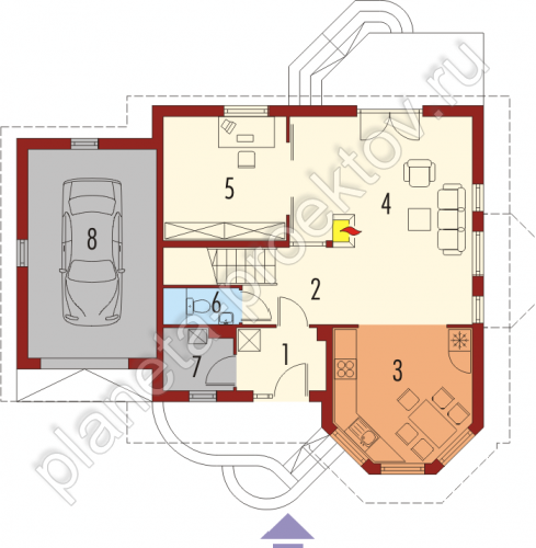 При всей внушительности внешнего облика дом довольно компактен, что выражается в его габаритах. Именно поэтому при проектировании не было оставлено места под свободные площади. Вытянутая комната с эркером образует гостиную, при этом в необособленном эркере планируется расположить кухню. Как бы продолжением гостиной служит кабинет, соединенный с ней дверями-купе. Санузел и техническое помещение завершают план коттеджа. На втором ярусе будет оформлена зона для отдыха, а дополнит ее ванная комната.