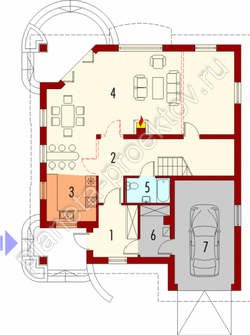 Пространственная организация помещений строится на основании учета конструктивных особенностей здания. Именно поэтому гостиная имеет нестандартную форму, при этом выходит она на галерею-террасу. Гостевая зона представляет собой вытянутую форму в виде угла, поэтому есть уникальная возможность разграничения гостевой и бытовой зоны, представленной кухней и столовой. В мансарде будет оформлена уютная зона отдыха, состоящая из трех комнат. В дополнение к ней будет обустроена ванная.