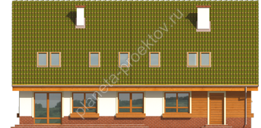 Простой с эстетической точки зрения дом в скандинавском стиле, построенный из блоков, органично впишется в любой загородный участок. В оформлении коттеджа оригинально смотрится широкая кровля, которая нависает над жилым строением. Не менее интересно выглядит оформление экстерьера, поскольку для отделки используются разные материалы: дерево, штукатурка и кирпич, который применяется для облицовки фундамента. С внутренней стороны коттеджа располагается длинная терраса, на которую выходят окна и двери внутренних помещений.