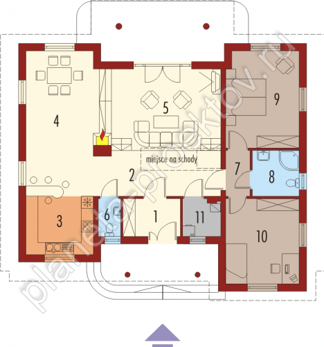 В создании пространственной организации помещений акцент делался на максимальную комфортность и рациональность, поскольку все жилые и бытовые комнаты будут располагаться на одном этаже. Строго центральную часть коттеджа занимает гостевая зона, при этом она плавно переходит в вытянутое в длину помещение, отданное под столовую и кухню. Обособленной группой располагаются две спальни, между которыми оборудована ванная. Связь жилого здания с окружающей природой производится с помощью двух выходов из коттеджа.