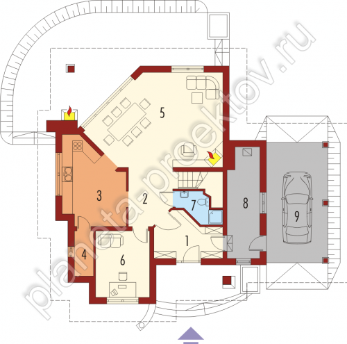 Особенность конструкции первого этажа в том, что конструкция гостевой зоны, которая совмещена еще и с кухней, имеет нестандартную конструкцию. Именно благодаря ней и складывается общее впечатление о внутренней планировке. Небольшой кабинет завершает количество жилых помещений, а из бытовых будет оборудоваться санузел. Из технического помещения можно выйти в пристроенный к дому гараж. В мансарде, которая запланирована под зону отдыха, основные помещения представлены спальнями, а в качестве дополнения выступает ванная.