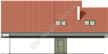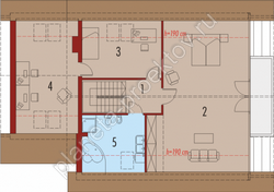 Наряду с большой площадью строения оно имеет также немаленький план, а потому для его размещения потребуется довольно большая территория. Коттедж не имеет отличительных декоративных элементов, при этом в конструкции нет даже террас, которые занимали бы еще больше места. Организация пространства строится на основании принципа свободы и открытости, поэтому весь первый этаж занят гостиной, сбоку которой размещается кухня. Одна стена гостиной полностью остеклена и через двустворчатые двери ведет во внутренний двор. А мансарде будут обустроены три спальни. Одна отличается большими размерами, и в ней можно сформировать удобную зону отдыха. Квадратная ванная завершит план строения.