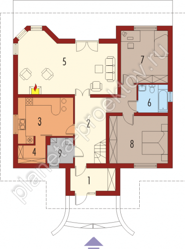 Пространственная организация помещения строится на основании принципов рациональности и функциональности, поскольку все комнаты располагаются на единственном этаже. Особенность планировки в том, что гостевая зона является полноценной комнатой, которая отделена от кухни. Отдельной группой располагаются две спальни, между которыми будет оборудована ванная.
