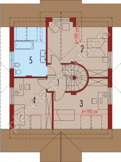 Среди выразительных элементов архитектуры, которые украшают данное здание, можно выделить люкарну, а также высокие, хоть и не панорамные окна. Компактность плана выражается в том, что и планировочное решение отличается лаконичностью и функциональностью. Пространство первого этажа представляет собой открытую зону, в которой все объекты взаимосвязаны друг с другом. При этом в доме будут обустроены сразу несколько выходов на террасу, тем самым реализуется принцип близости к окружающей среде. Мансарда отводится под зону личного пользования, в которой будут оформлены несколько спален, а в дополнение к ним оборудуется ванная.