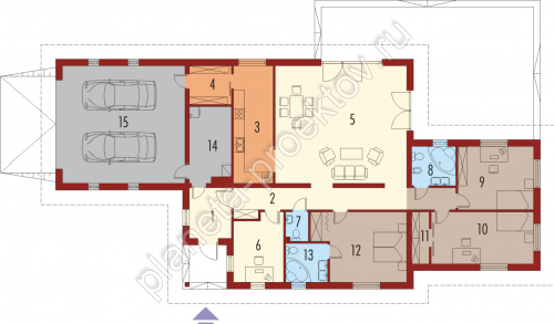 Планировочное решение также отличается тщательной продуманностью, поскольку на единственном уровне будут расположены и жилые, и бытовые помещения. Гостиная и кухня, которые соединены, образуют гостевую зону. Группа помещений из трех комнат образует зону отдыха, а из бытовых планируется оборудование сразу трех санузлов и технического помещения, которое связывает жилое помещение с гаражом.