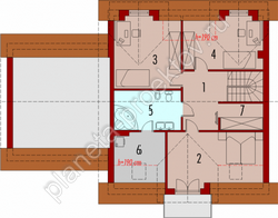 Компактный план конструкции никак не отражается на просторности коттеджа, который состоит из двух жилых ярусов. Именно поэтому для него характерно четкое зонирование. Гостиная отделена от кухни лестницей, ведущей в мансарду. Оформление небольшого кабинета, санузла и технического помещения завершается планировочное решение первого этажа. В мансарде, согласно плану, будет отдана под оформление зоны личного пользования, состоящую из спален и ванной.