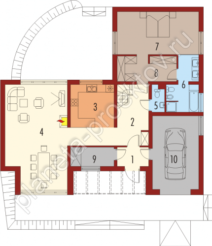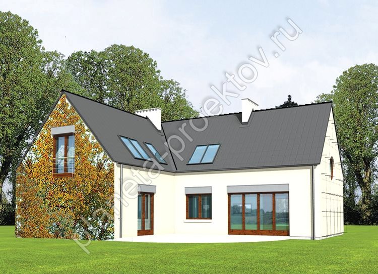 Современное направление в строительстве позволяет возводить необычные по форме конструкции, которые буду выполняться с точки зрения особенного дизайна и оформления жилой площади. Крутая двускатная кровля придает данному коттеджу необычный вид, при этом даже компактная мансарда используется для размещения в ней жилых комнат. Два эркера, отделанных деревом, образуют соответственно кухню и гараж. Небольшая полукруглая галерея-терраса располагается с внутренней части фасада.