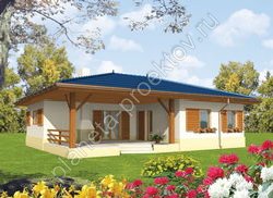 С точки зрения организации пространства все отличается логичностью и практичностью. Вместо гаража планируется обустроить навес, а украшением входной группы и выхода с крытой террасы во двор являются колонны. Ввиду того, что коттедж не отличается большими размерами, все помещения будут располагаться на единственном этаже. При этом гостевая зона отграничивает от зоны отдыха, а кухня будет располагаться в гостиной. Завершается планировка обустройством ванной. Удобный и функциональный коттедж – хороший выбор для любого дачного участка.