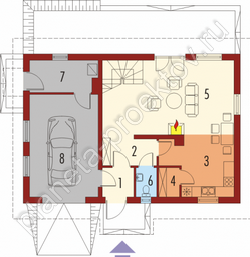 Первый этаж отведен под зону отдыха, при этом планировка предполагает совмещение гостиной, кухни и столовой. В плане этажа запроектирован также гараж, который связан с жилым помещением сразу через холл. В мансарде, занятой зоной отдыха, будут запланированы три спальни и две ванные. При всей компактности строения выглядит оно солидно и надежно. Для сторонников строительства из натуральных материалов больше подойдут проекты домов из кирпича или дерева, представленные в нашем каталоге.