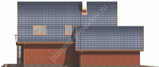 В качестве отделочного материала выбран кирпич, за счет чего коттедж выглядит стильно и представительно. Для тех, кому предпочтительнее строительство из натуральных материалов, больше подойдут проекты деревянных домов. Данное строение из кирпича отличается современностью и колоритным внешним обликом, а также функциональностью и рациональностью планировки. Основная часть пространства первого этажа занята гостевой зоной с полукруглым эркером, кухня занимает в этом помещении небольшое место. Напротив нее оборудуется санузел. Кабинет и техпомещение, которое связывает жилое здание с гаражом, завершают план. Три спальни в сочетании с ванной завершают планировочное решение всего коттеджа.