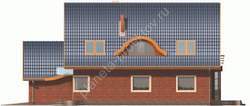 Необычное художественное решение, принятое для данного дома в стиле кантри, сразу привлекает внимание. Оригинальность конструкции заключается вы необычной изогнутости кровли, благодаря чему коттедж смотрится сказочно и ярко. Причем благодаря такой форме увеличивается жилая площадь мансарды, а также открываются широкие возможности для удобной планировки. Полукруглой формы эркер оформляет галерею-террасу, а сверху над ней располагается такой же конфигурации балкон.