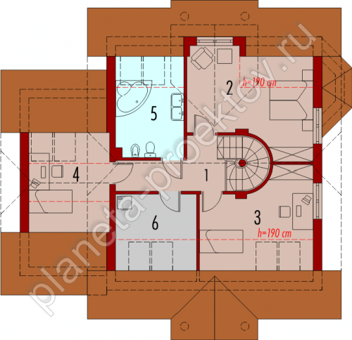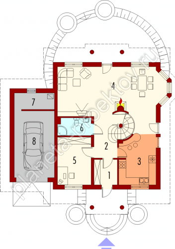Точно такие же колонны оформляют галерею-террасу в виде полукруга, где достаточно места для обустройства зоны отдыха. За счет жилой мансарды пространство первого яруса кажется свободным и наполненным воздухом. Да и в самой планировке акцент сделан именно на открытости – гостиная занимает практически весь этаж. Связь с участком осуществляется через несколько входов. Мансарде отведена роль зоны личного пользования, где будут располагаться спальни и ванная. Аналогичные этому коттеджу строения можно возвести по проектам деревянных домов.